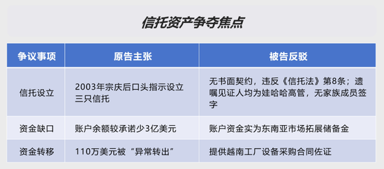 信托效力之争成为首轮交锋焦点。原告声称2003年宗庆后通过汇丰银行设立三只离岸信托,每只7亿美元,但未能提供其签署的书面契约。有信源称,宗馥莉团队出示了宗庆后2020年遗嘱,内容包括境外资产由宗馥莉继承等,并质疑信托文件法律效力。